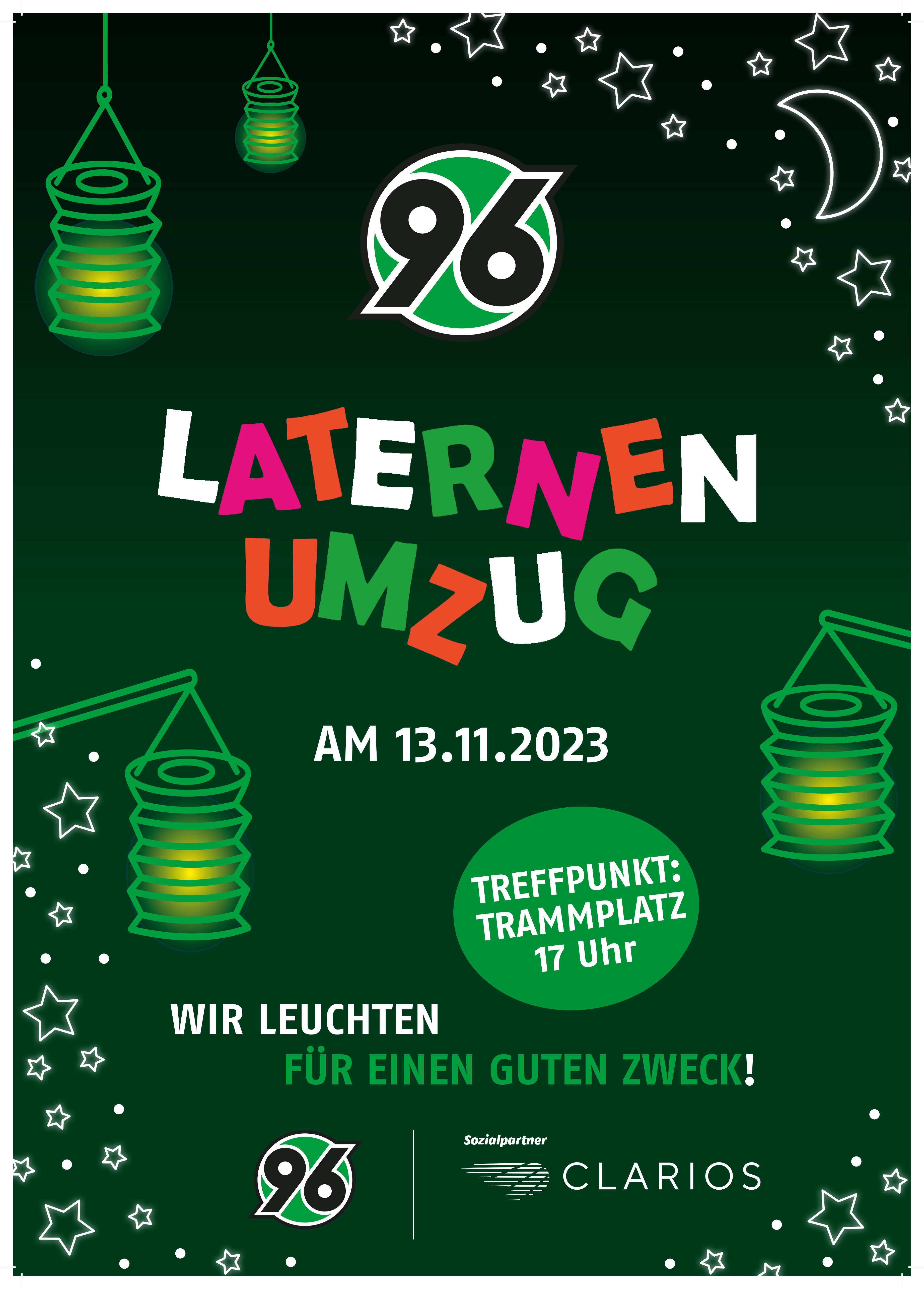 Laterne, Laterne, Sonne, Mond und Sterne – bereits zum elften Mal lädt Hannover 96 zusammen mit Sozialpartner Clarios am Montag, den 13. November 2023, alle Kinder, Jugendlichen, Eltern, Großeltern sowie alle Interessierten aus der Stadt und Region Hannover zum gemeinsamen Laternenumzug für den guten Zweck ein.
