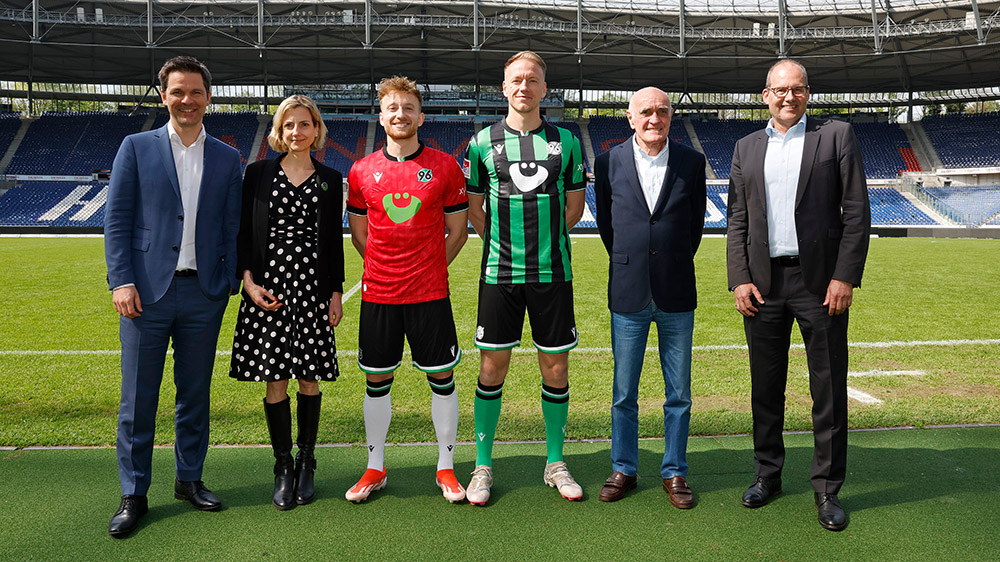 Regionspräsident Steffen Krach (von links), ÜSTRA-Vorstandsvorsitzende Elke Maria van Zadel, Jannik Dehm, Havard Nielsen, 96-Geschäftsführer Martin Kind und Ulf-Birger Franz, GVH-Geschäftsführer und Wirtschafts-, Verkehrs- und Bildungsdezernent der Region, stellten die neue Partnerschaft vor. (Foto: 96/Kaletta)